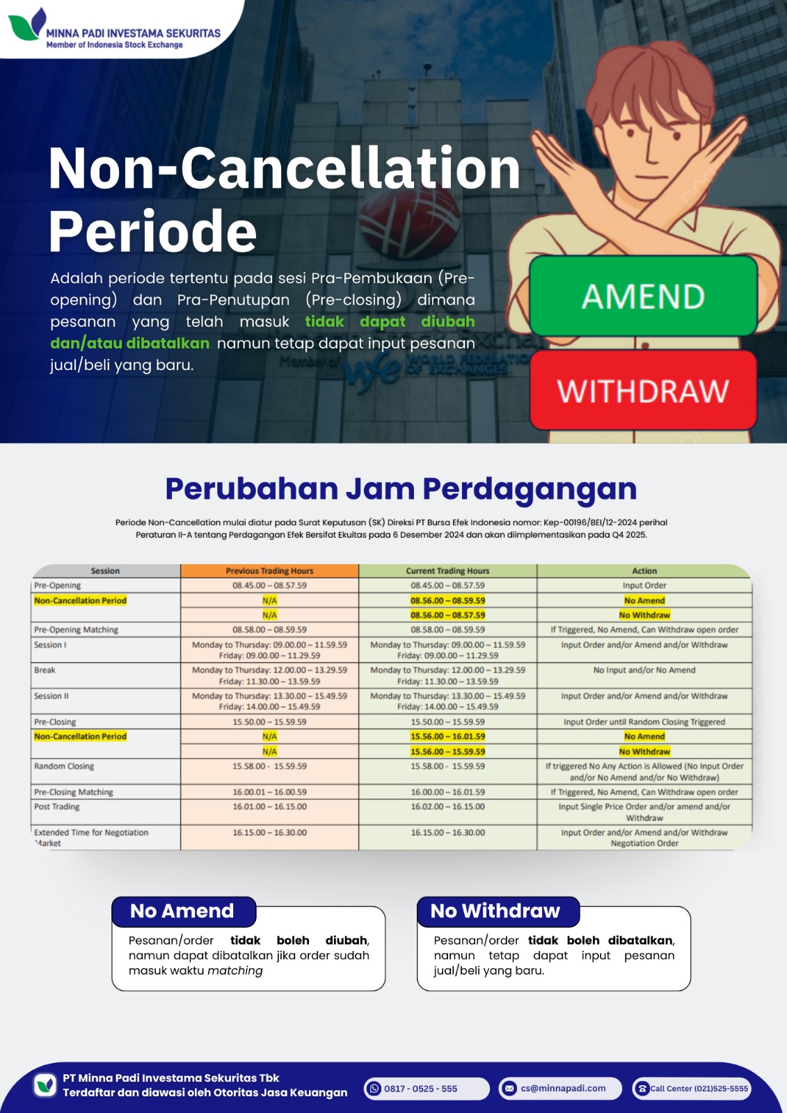 HARI INI! tanggal 15 Desember 2025 Non Cancellation Periode telah resmi diterapkan. Jadi Temans, pada sesi Pra-Pembukaan (Pre-opening) dan Pra-Penutupan (Pre-closing) dimana pesanan yang telah masuk tidak dapat diubah dan/atau dibatalkan, namun tetap dapat input pesanan jual/beli yang baru.