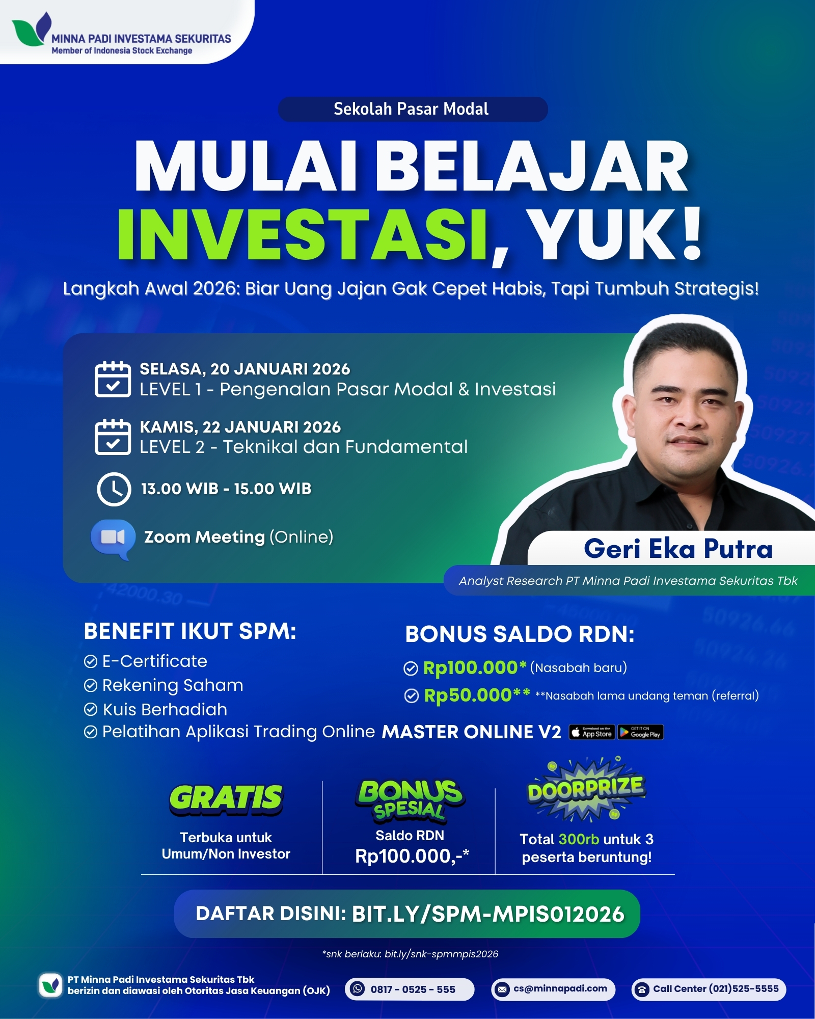 - Bonus Saldo RDN Rp100.000,- berlaku khusus untuk calon nasabah pengguna baru aplikasi Master Online V2 yang terdaftar sebagai peserta dan mengikuti acara Sekolah Pasar Modal PT Minna Padi Investama Sekuritas Tbk Tahun 2026.